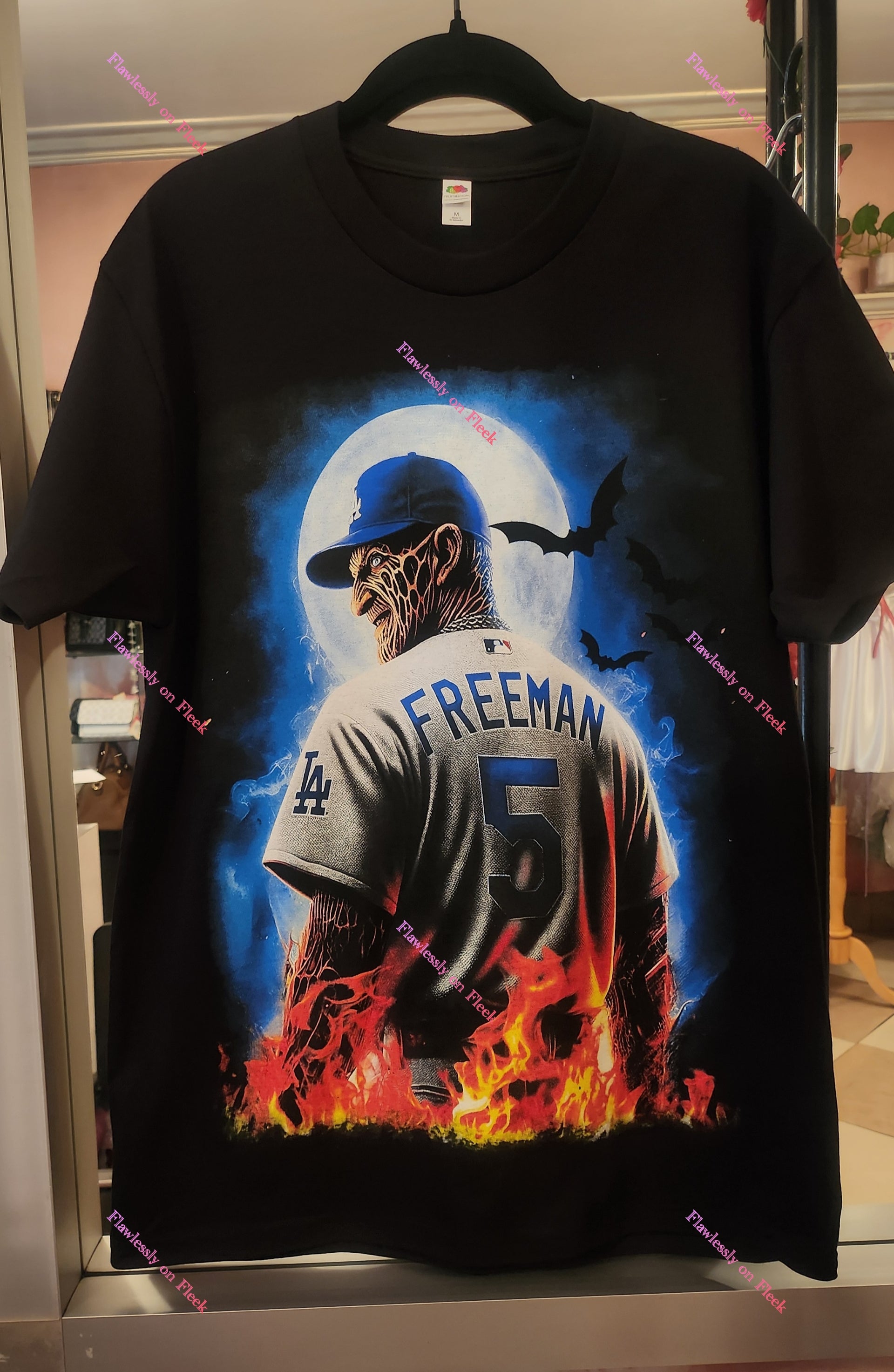 This unique t-shirt combines baseball and horror with Freddy Krueger wearing a baseball jersey and against a spooky backdrop. Perfect for fans of both worlds, this shirt is sure to turn heads and inspire conversation.me.